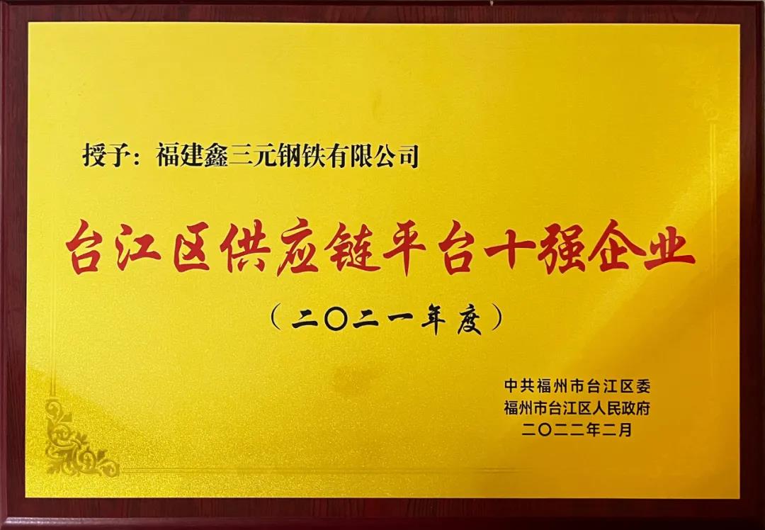 明海鑫旗下福建鑫三元鋼鐵有限公司,榮獲中共福州市臺江區(qū)委福州市臺江區(qū)人民政府頒發(fā)的2021年度“臺江區(qū)供應(yīng)鏈平臺十強(qiáng)企業(yè) ”稱號。