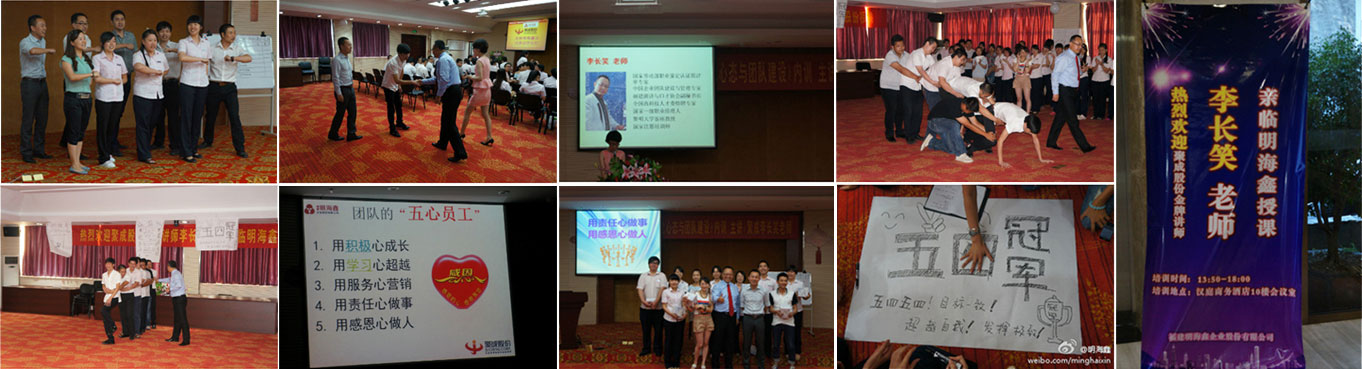 2013年6月29日,福建明海鑫企業股份有限公司邀請聚成集團金牌講師李長笑老師給明海鑫全體員工授課,培訓主題是《職業化心態與團隊建設》,課上大家學到了打開心中花園與建立陽光心態,角色的交流互補與團隊精神,在歡笑、激情、感動、感恩中圓滿完成了培訓,感謝李長笑老師、感謝明海鑫、感謝大家。